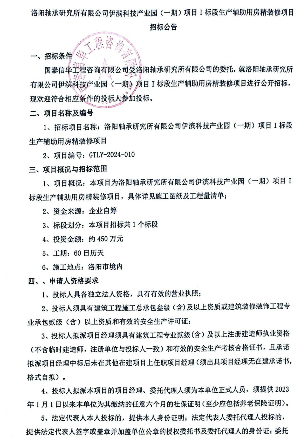 洛陽軸承研究所有限公司伊濱科技產(chǎn)業(yè)園建設(shè)項目一期一標段輔房精裝修中標結(jié)果公告