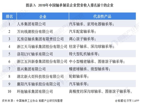 2019年,中國軸承制造企業(yè)軸承營業(yè)收入排名前十大企業(yè)的企業(yè)分別是人本集團有限公司、萬向錢潮股份有限公司、瓦房店軸承集團有限責任公司、浙江天馬軸承集團股份有限公司、洛陽LYC軸承有限公司、浙江五洲新春集團股份有限公司、慈興集團有限公司、湖北新火炬科技股份有限公司、襄陽汽車軸承股份有限公司和環(huán)馳軸承集團有限公司。