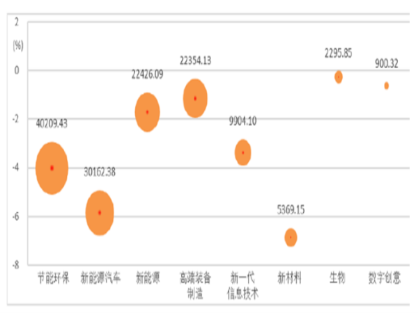 圖1 戰(zhàn)新產(chǎn)業(yè)大類營(yíng)業(yè)收入情況及同比增速分布(%、億元)
